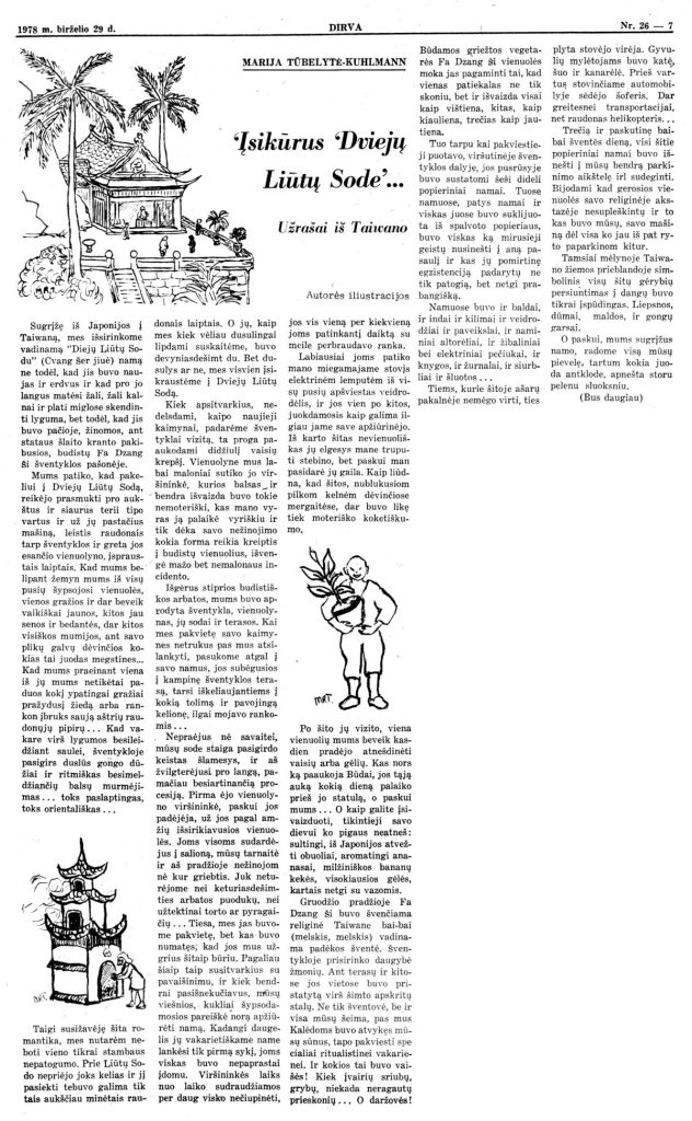 The first story from the “Notes from Taiwan” series, which was published by Marija Rima Tūbelytė-Kuhlmann in the Dirva issue dated June 29, 1978. Pirmasis pasakojimas iš serijos „Užrašai iš Taivano“, kurį Marija Rima Tūbelytė-Kuhlmann paskelbė 1978 m. birželio 29 d. „Dirva“ numeryje.