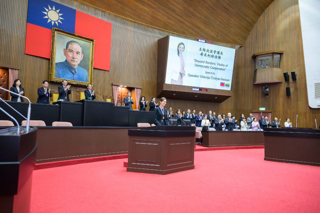 Viktorija Čmilytė-Nielsen, Speaker of the Seimas, giving a speech at the Taiwanese Parliament in Taipei on October 23, 2023 / Source: Taiwan Legislative Yuan Seimo pirmininkė Viktorija Čmilytė-Nielsen, sakanti kalbą Taivano parlamente Taipėjuje 2023 m. spalio 23 d. / Šaltinis: Taivano įstatymų leidybos rūmai