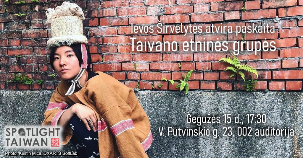 Public lecture poster of Ieva Širvelytė about Taiwanese ethnic groups at Vytautas Magnus University, 15 May 2023 Ievos Širvelytės viešos paskaitos apie Taivano etnines grupes plakatas Vytauto Didžiojo universitete, 2023 m. gegužės 15 d.