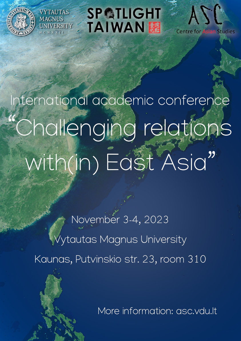 Poster of international academic conference Challenging Relations With(in) East Asia held at Vytautas Magnus University and organized by Centre for Asian Studies with support from Spotlight Taiwan, 3-4 November 2023