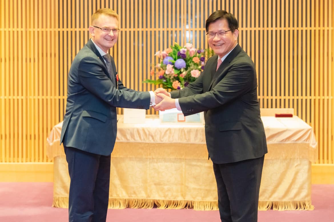 Foreign Minister Lin Chia-lung awards a medal to former Lithuania Health Minister Arūnas Dulkys in Taipei City (November 6, 2024) / Source: Taiwan MOFA Užsienio reikalų ministras Lin Chia-lung apdovanoja medaliu buvusį Lietuvos sveikatos apsaugos ministrą Arūną Dulkį Taipėjuje (2024 m. lapkričio 6 d.) / Šaltinis: Taivano užsienio reikalų ministerija