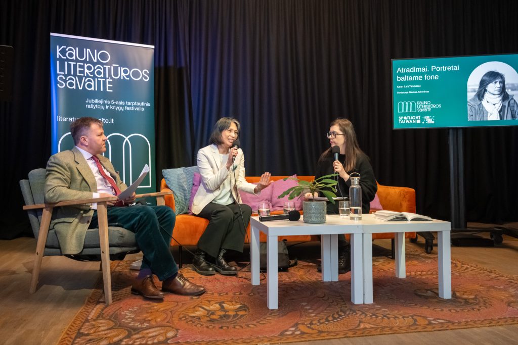 Kaori Lai next to Mantas Adomėnas and Vilma Matulevičienė during Kaunas Literature Week (May 10, 2025) / Source: Jonas Petronis
