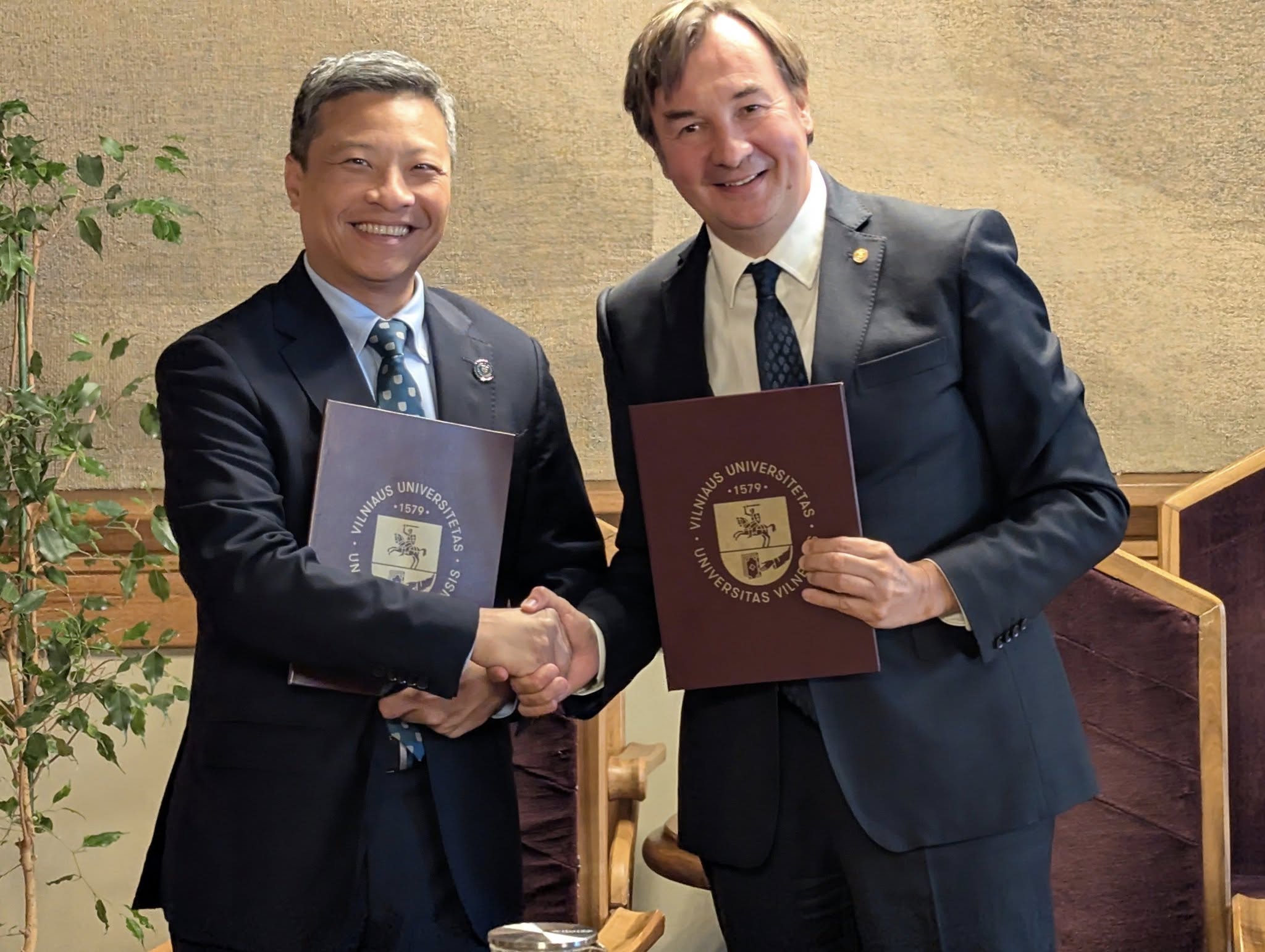 NCCU President Prof. Tsai-Yen Li and VDU Rector Prof. Juozas Augutis during the signing of the agreement on the establishment of the Lithuanian Center at NCCU with the assistance of VDU. April 25, 2024 / Source: VDU NCCU prezidentas prof. Tsai-Yen Li ir VDU rektorius prof. Juozas Augutis susitarimo metu dėl Lietuvos centro steigimo NCCU su VDU pagalba. 2024 m. balandžio 25 d. / Šaltinis: VDU
