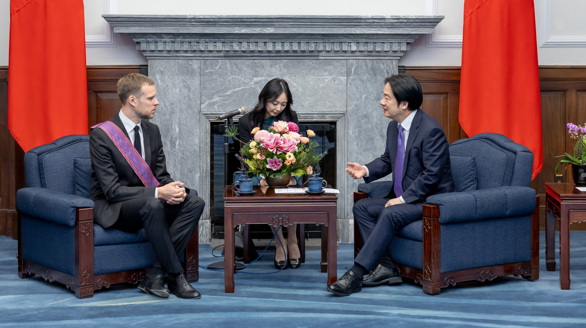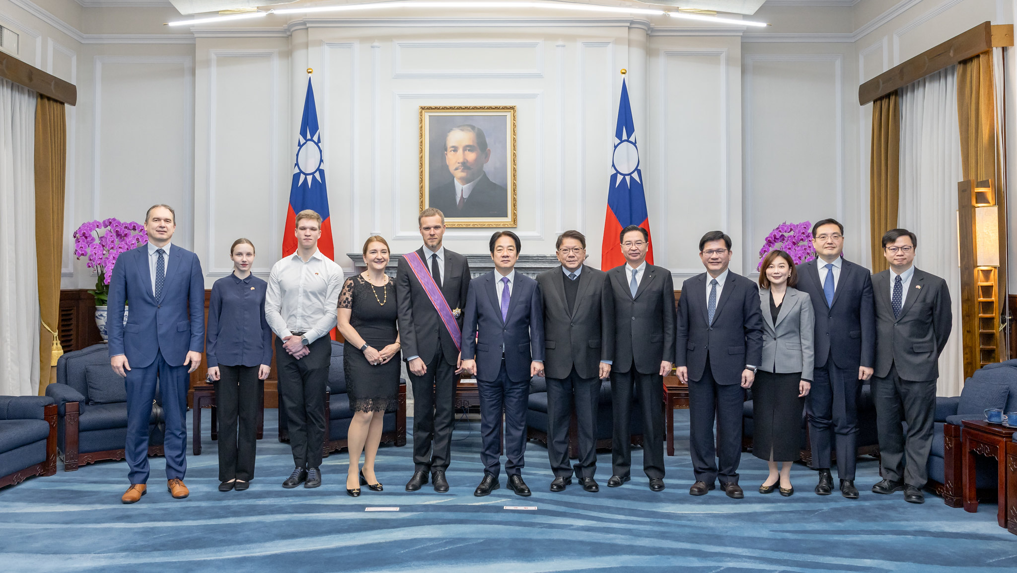 On January 14, 2025 President Lai Ching-te conferred the Order of Brilliant Star with Special Grand Cordon upon former Minister of Foreign Affairs Gabrielius Landsbergis. / Source: Office of the President of Taiwan 2025 m. sausio 14 d. prezidentas Lai Ching-te apdovanojo buvusį užsienio reikalų ministrą Gabrielių Landsbergį „Brilliant Star“ ordinu su specialiuoju didžiuoju kordonu. / Šaltinis: Taivano prezidento kanceliarija