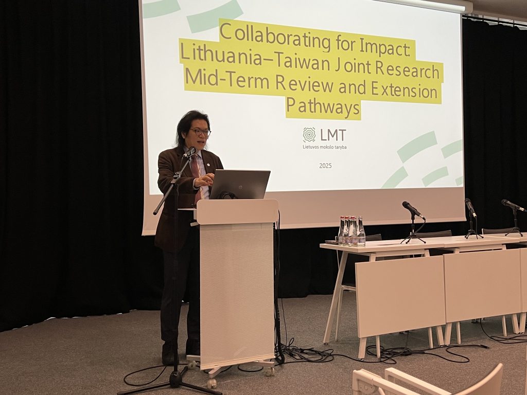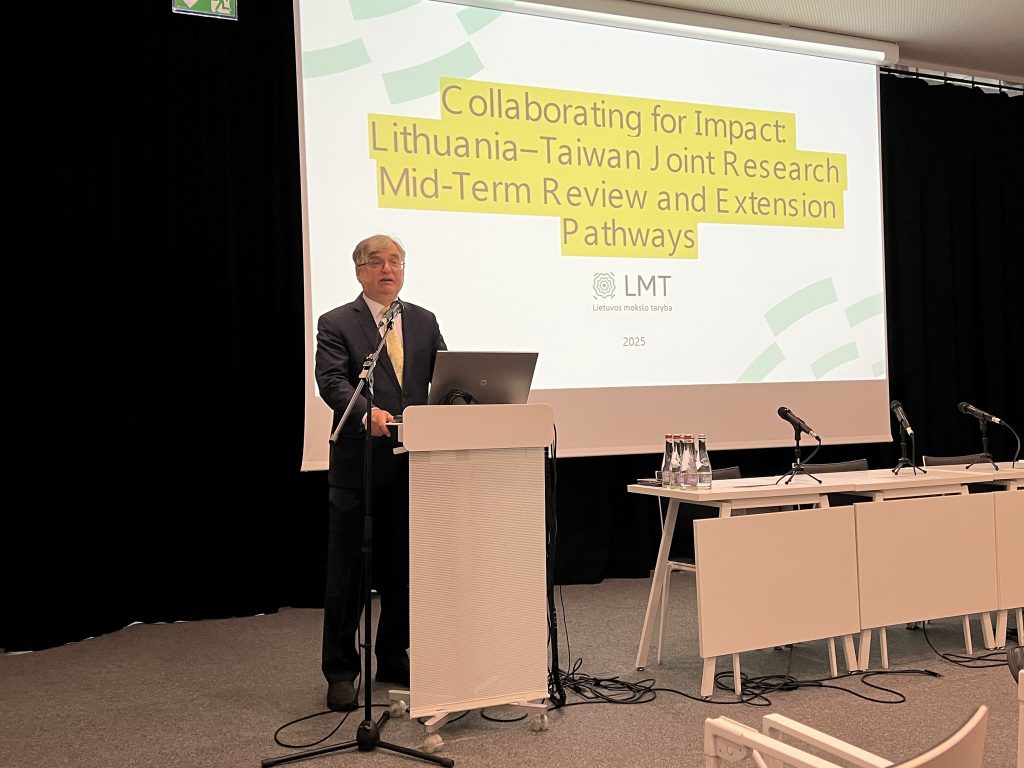 Prof. Gintaras Valinčius, Chairman of the Lithuanian Science Council, at an international seminar ‘Collaborating for Impact: Lithuania–Taiwan Joint Research Mid-Term Review and Extension Pathways’ held at the Scientific Communication and Information Center of Vilnius University on September 18, 2025 / Source: Taiwanese Representative Office in Lithuania Lietuvos mokslo tarybos pirmininkas prof. Gintaras Valinčius tarptautiniame seminare „Bendradarbiavimas siekiant poveikio: Lietuvos ir Taivano bendrų mokslinių tyrimų tarpinė peržiūra ir pratęsimo galimybės“, kuris vyko 2025 m. rugsėjo 18 d. Vilniaus universiteto Mokslo komunikacijos ir informacijos centre / Šaltinis: Taivano atstovybė Lietuvoje