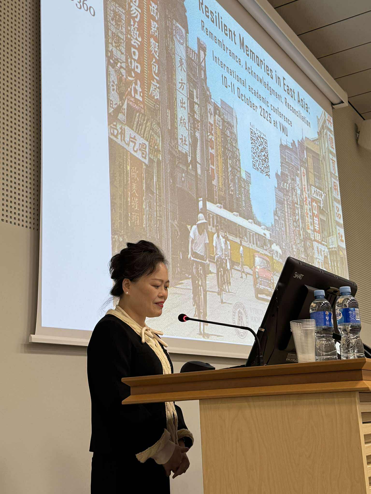 Constance Wang, head of the Taiwanese Representative Office in Lithuania, saying greetings during academic conference Resilient Memories in East Asia at Vytautas Magnus University, October 10, 2025 / Source: VMU Centre for Asian Studies Constance Wang, Taivano atstovybės Lietuvoje vadovė, sveikina dalyvius akademinėje konferencijoje Resilient Memories in East Asia, vykusioje Vytauto Didžiojo universitete 2025 m. spalio 10 d. / Šaltinis: VDU Azijos studijų centras