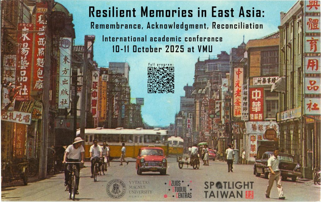 Poster of international academic conference Resilient Memories in East Asia that took place in Vytautas Magnus University on 10-11 October 2025. The conference was organized by Centre for Asian Studies and supported by Spotlight Taiwan / Source: VMU Centre for Asian Studies