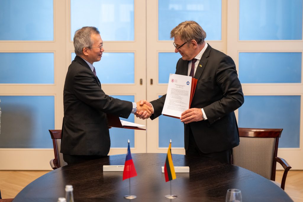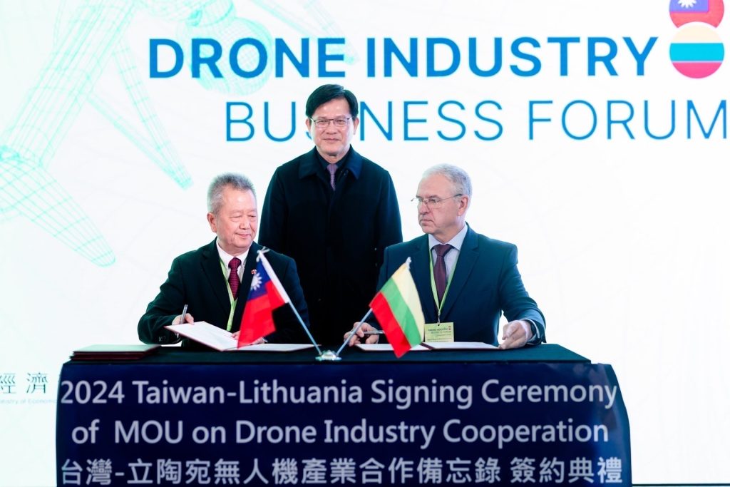 Foreign Minister Lin Chia-lung (center) witnesses the signing of the Memorandum of Understanding between the Taiwan Excellence Drone International Business Opportunities Alliance and the Lithuanian Defence and Security Industry Association. 2024 November 22 / Source: Taiwanese MOFA Užsienio reikalų ministras Lin Chia-lung (centre) liudija susitarimo memorandumo pasirašymą tarp „Taiwan Excellence Drone International Business Opportunities Alliance“ ir Lietuvos gynybos ir saugumo pramonės asociacijos. 2024 m. lapkričio 22 d. / Šaltinis: Taivano užsienio reikalų ministerija