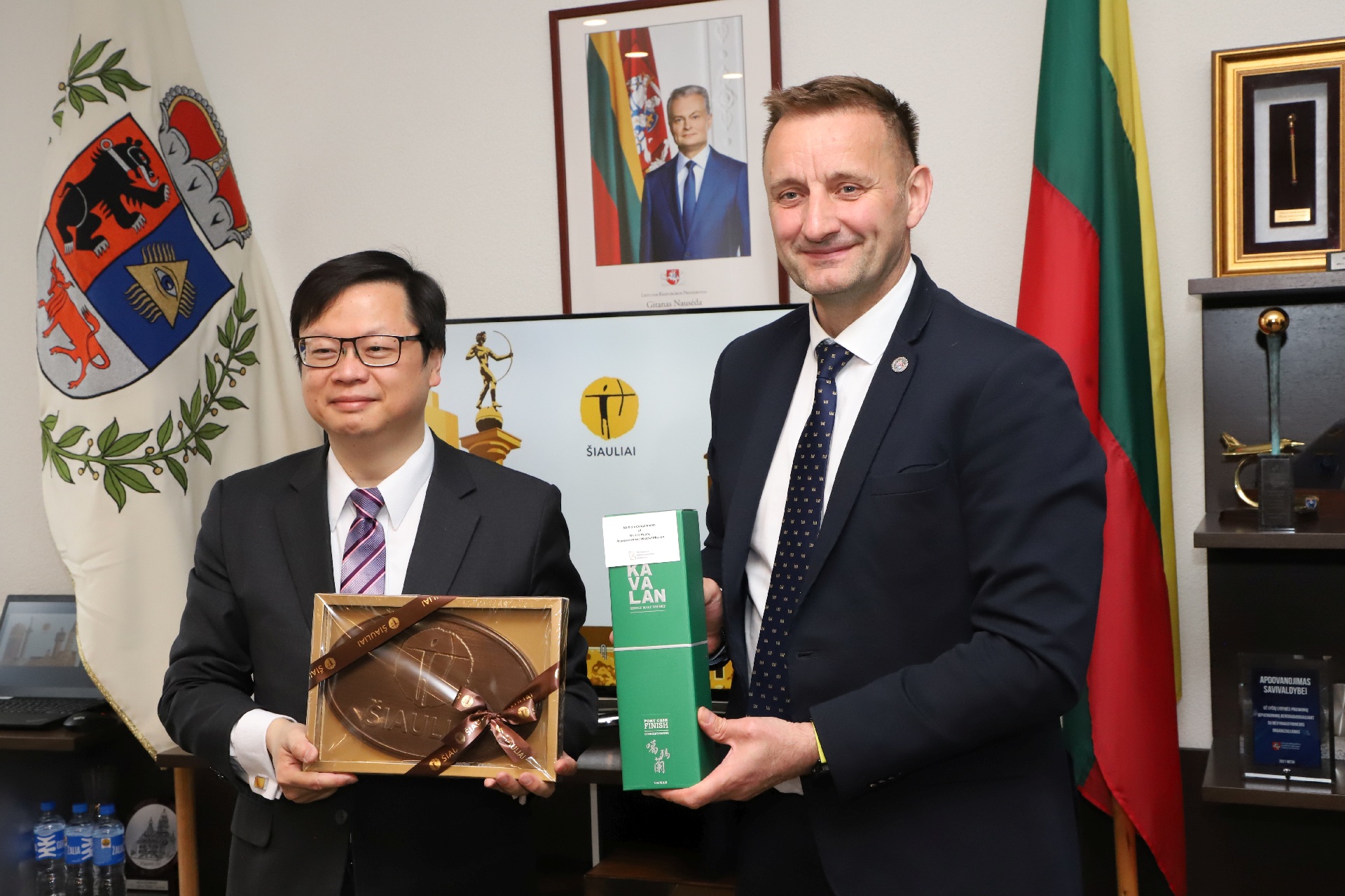 Ambassador Eric Huang of the Taiwanese Representative Office in Lithuania during his visit to Šiauliai, meeting with Šiauliai Mayor Artūras Visockas. April 2023 / Source: Šiauliai City Municipality Taivaniečių atstovybės Lietuvoje ambasadorius Eric Huang vizito metu į Šiaulius, susitikime su Šiaulių miesto meru Artūru Visocku. 2023 m. balandis / Šaltinis: Šiaulių miesto savivaldybė